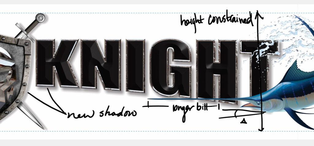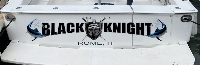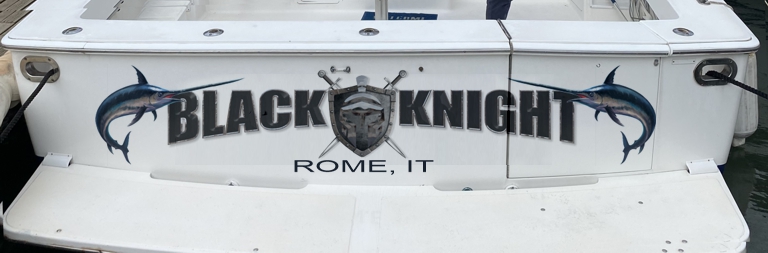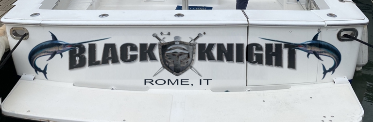 These boat graphic ideas are for a 43′ Viking fishing in the Mediterranean. The long bills on the marlin reference the Pinocchio character and the habit many fishermen have of exaggerating the truth. The sentiment for this Black Knight is leaning toward the Monty Python version, a character that “None shall pass.” Arthur proceeds to cut off his arms…”Just a flesh wound.” – A Black Knight cannot fail! Check out the youtube vid linked above.