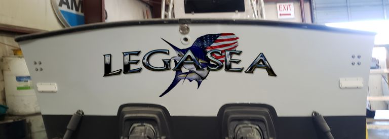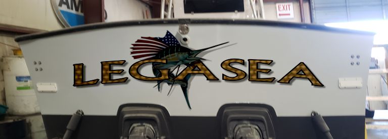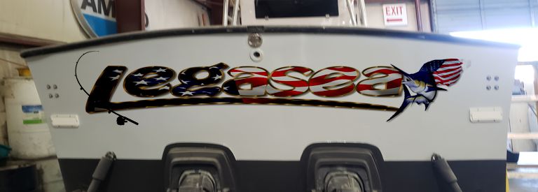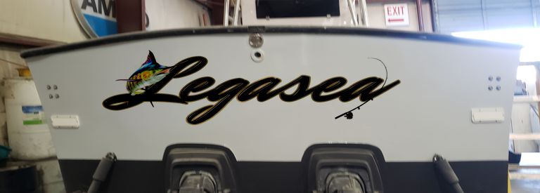 In this boat lettering project we started out with a white hull and the customer then decided to paint it blue. We took his favorite design and reversed the outline to help it stand out on a darker hull color. Moving the fish to the side allowed for the largest lettering across the transom.