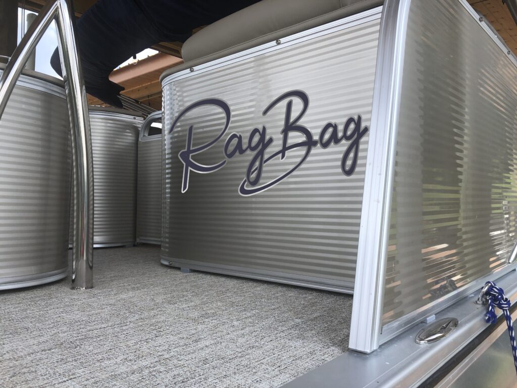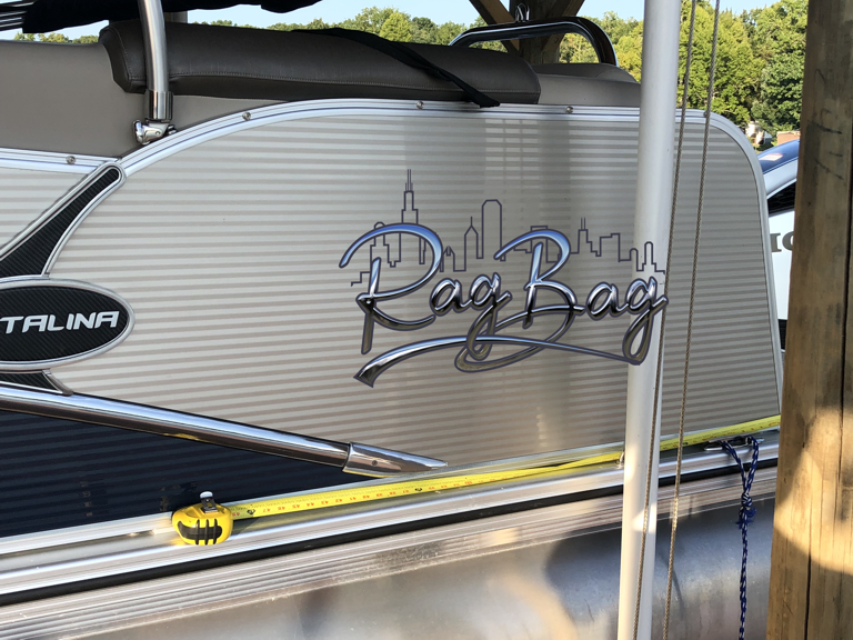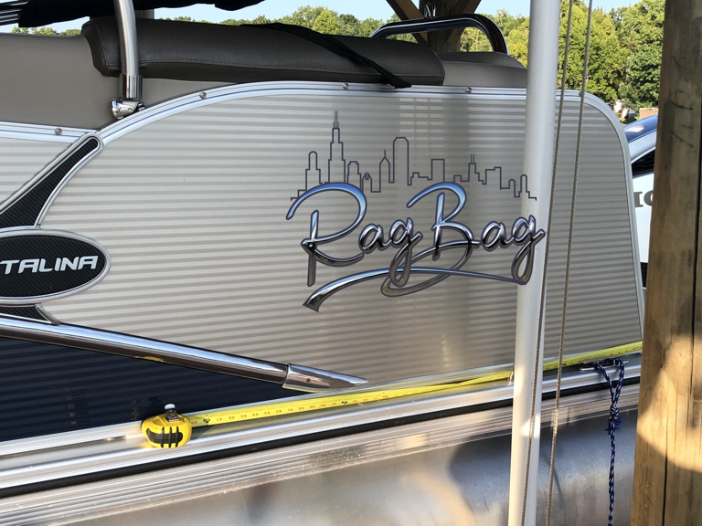 6. hull preview, I kept the lettering centered although you could get away with lowering it a little.6. raised the skyline and rotated the name5. swoosh and skyline5. hull preview for port and starboard1. chrome bevel letterface with swoosh1a. without swoosh1a hullpreview. I think it would be interesting to see these port and starboard, if you have a shot square on from the side.Rendition of what this might look on the side quarter panels.1b. cobalt blue with silver foil outline2. one color simple3. chrome bevel outline around cobalt blue with hard black shadow, Chicago skyline above3. hull preview sans the chrome outline, 4. cobalt blue face with metallic silver skyline overprinting below.4 hull preview…the striping is my edit to illustrate the waviness, but the blue would look more like the hull colors in reality esp if this was not printed but just cut vinyl.