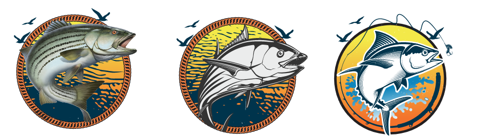 6. All caps gold leaf with sun6. hull 7. gold paint with bevel7. hull previewLogo generation using sun theme and bass1. black script with graffiti hand holding hook1. hull preview charters centered2. black bevel face with gold chrome outline and double hooks3 Treble clef as ampersand3. hull preview position4. chrome face with the striped bass logo centered4. hull preview5. rod and wave5. hull preview