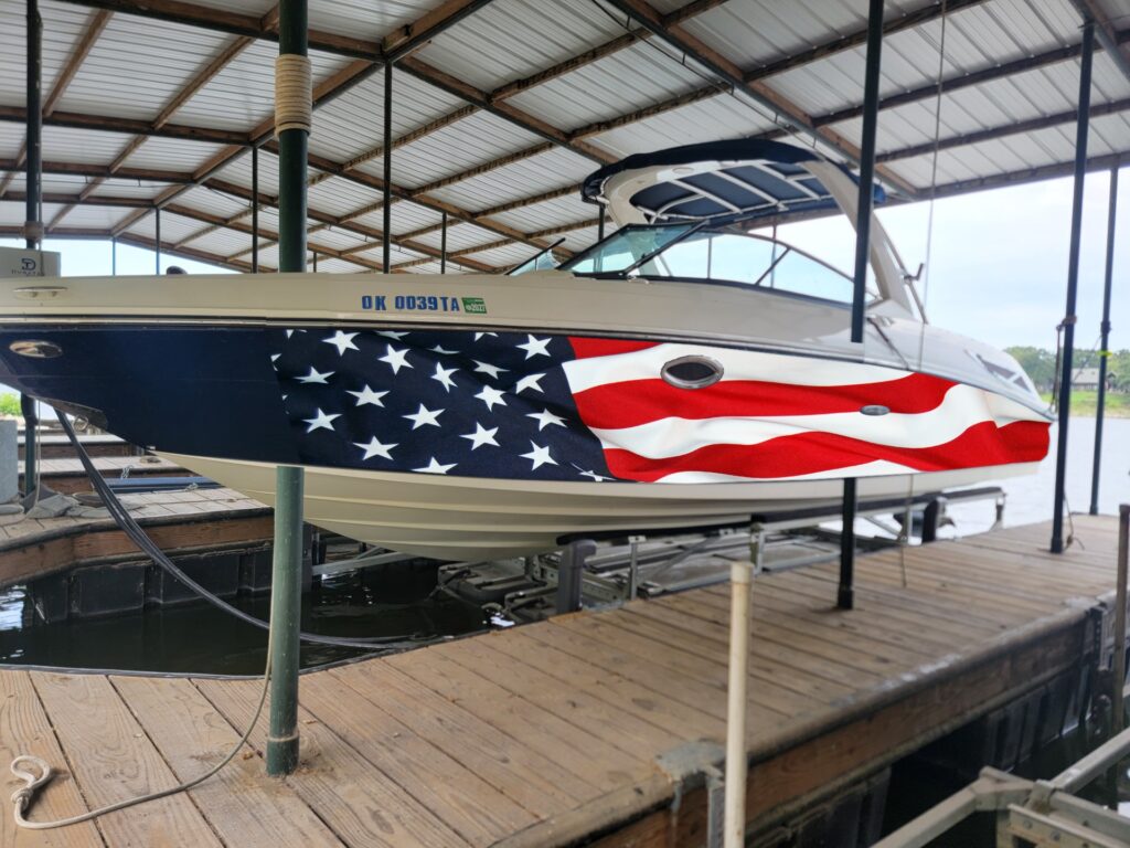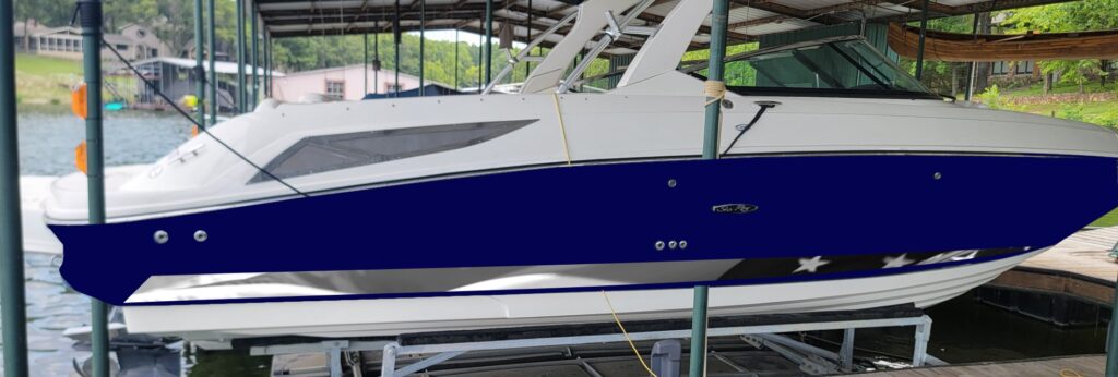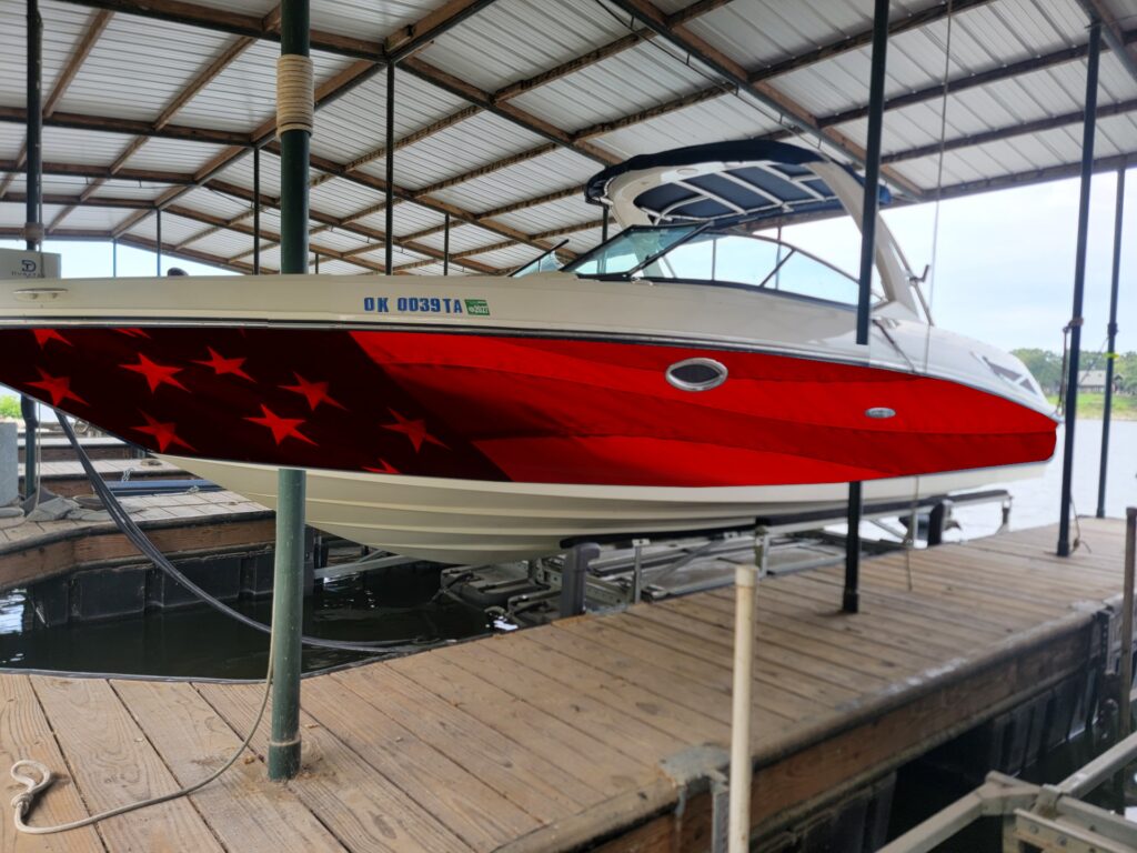 Of all these flag layouts, I like this shape on the stripe best and would mirror that for the starboard side. The “red” stripe flows toward the back evenly an swoops up in the stern. The field of stars is angled back giving the image a speedier line. The red is just for fun, but the flag wrap image can be printed on anything, including the silvers. Anything printed will be laminated for UV protection and is quite glossy.