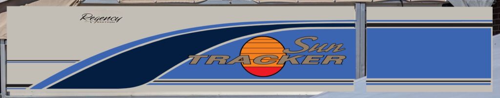 Our mission – Refurbishing the old pontoon after years of sun damage. Preserving the original lines and exploring how to integrate more blue into the design. The original was gold metallic which has faded. The stripes and graphics are peeling off and need to all be redone.